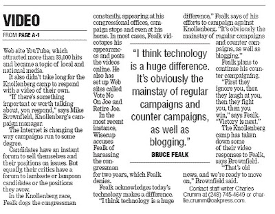 The Move.on.org money helps pay for a bag of dirty tricks. Bruce Fealk, a Democratic operative, has made it his mission to follow Knollenberg around firing questions at him while filming with a video camera.